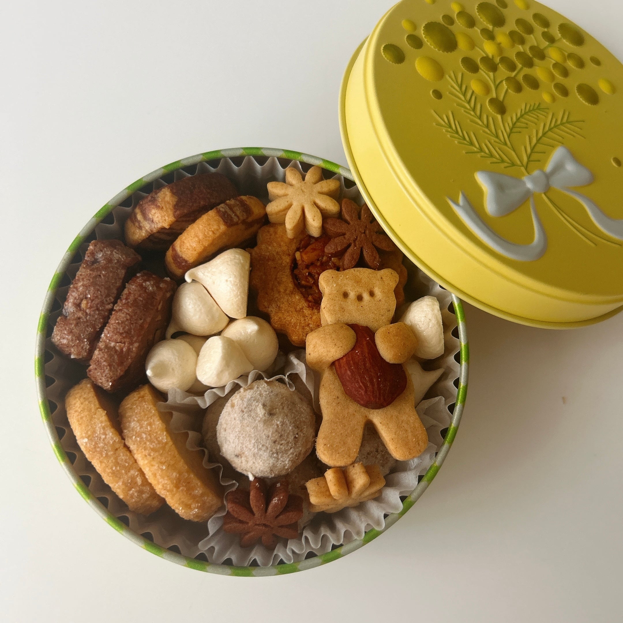 8種類のクッキーを可愛いミモザの缶に詰めました。